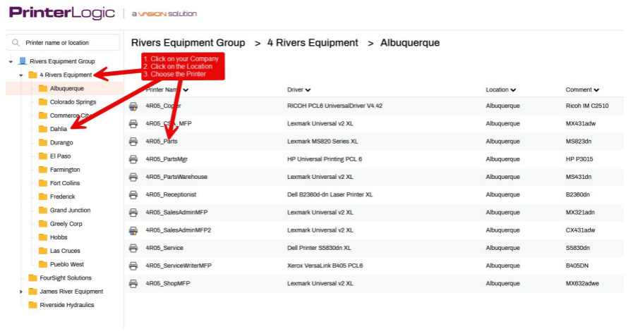 Navigate to https://riversequipmentgroup.printercloud.com - it will prompt you to add the extension