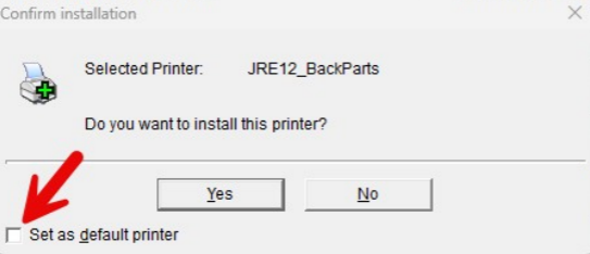If this is your default printer, check the 'set as default printer' box before clicking yes to install: