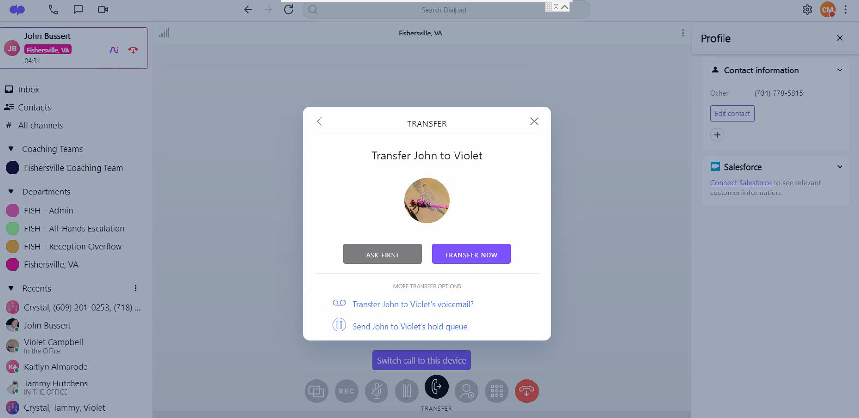 - Click on the Transfer Button in the Dialpad app (bottom of the dialpad screen)